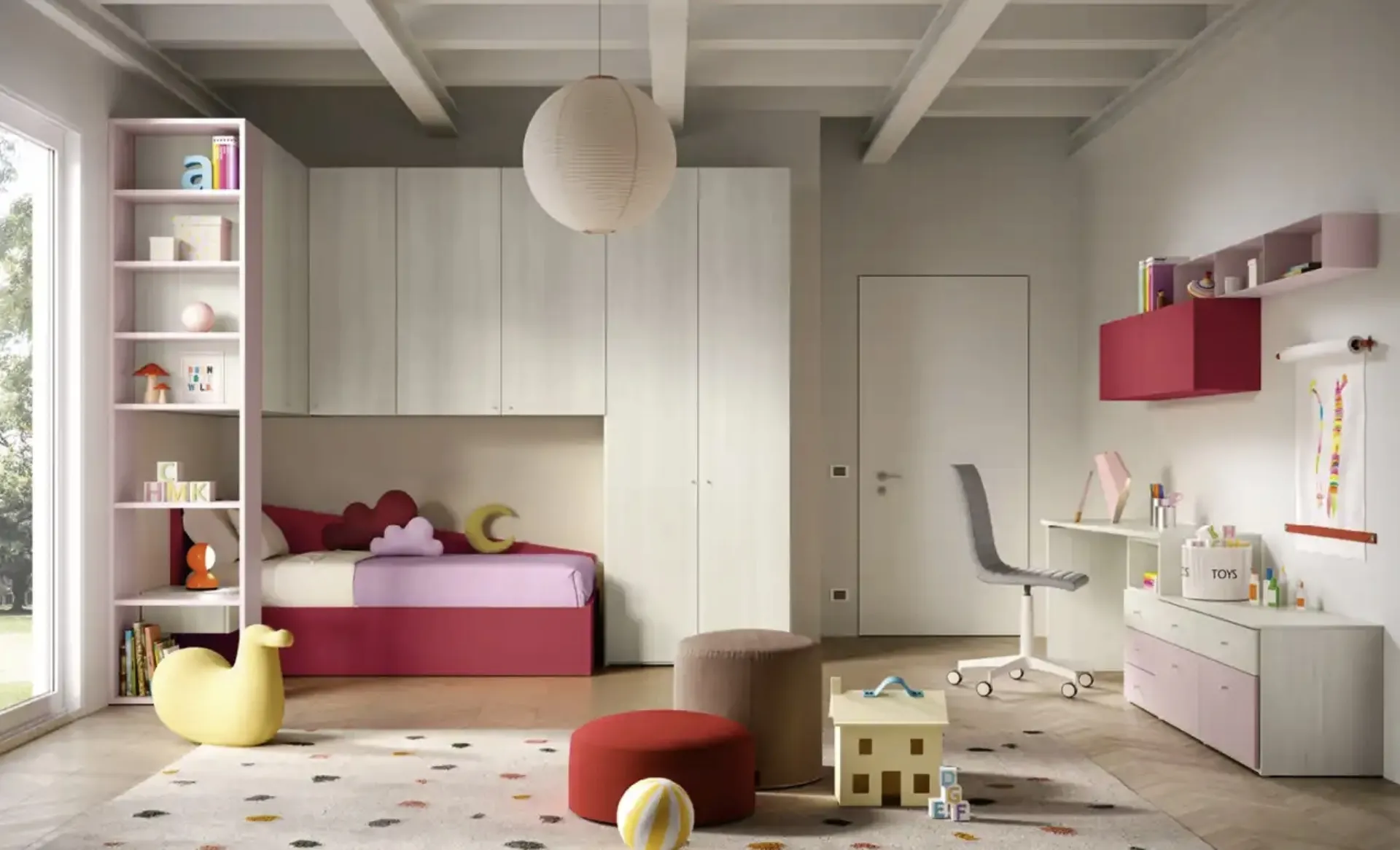 Moretti Compact Camerette propone una ricca gamma di accessori da accostare su misura: troverai letto, armadio o cabina armadio, scrivania, sedie e librerie. Nell'arredo della stanza dei piccoli affidati a noi: nel nostro showroom presentiamo tutte le più belle composizioni moderne per la loro camera. Porta contenuto estetico e colori vivaci nella stanza dedicata ai bambini con questa proposta, una delle Camerette a ponte per bambine di Moretti Compact Camerette. Se cerchi spunti creativi per decorare alla perfezione la stanza dei tuoi bambini, ti presentiamo la Cameretta K119 di Moretti Compact Camerette con finitura in melaminico.