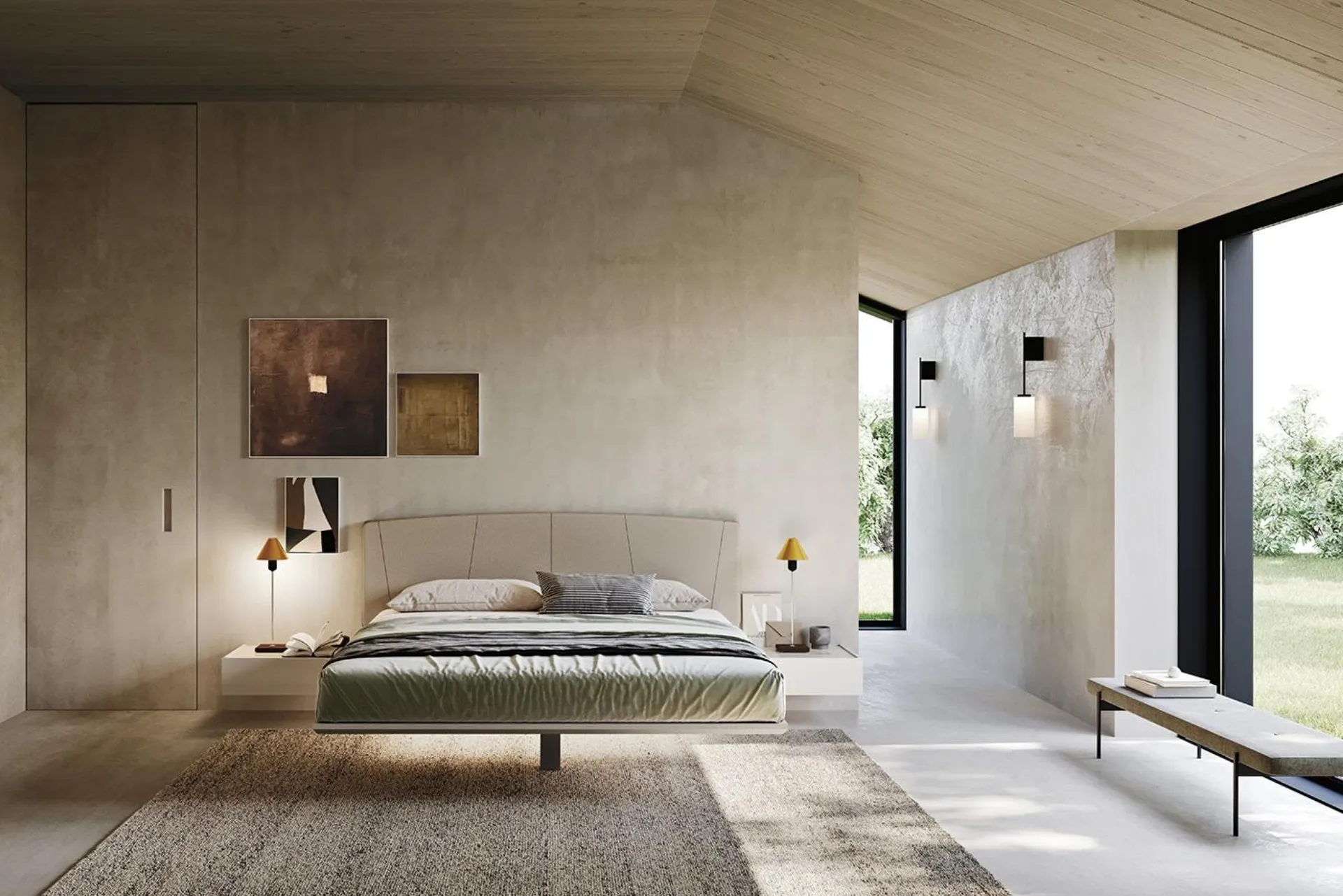 Il letto Sospeso N16 in tessuto, tra i modelli con testiera matrimoniali design di Mobilgam, è perfetto per garantirti il relax totale.
