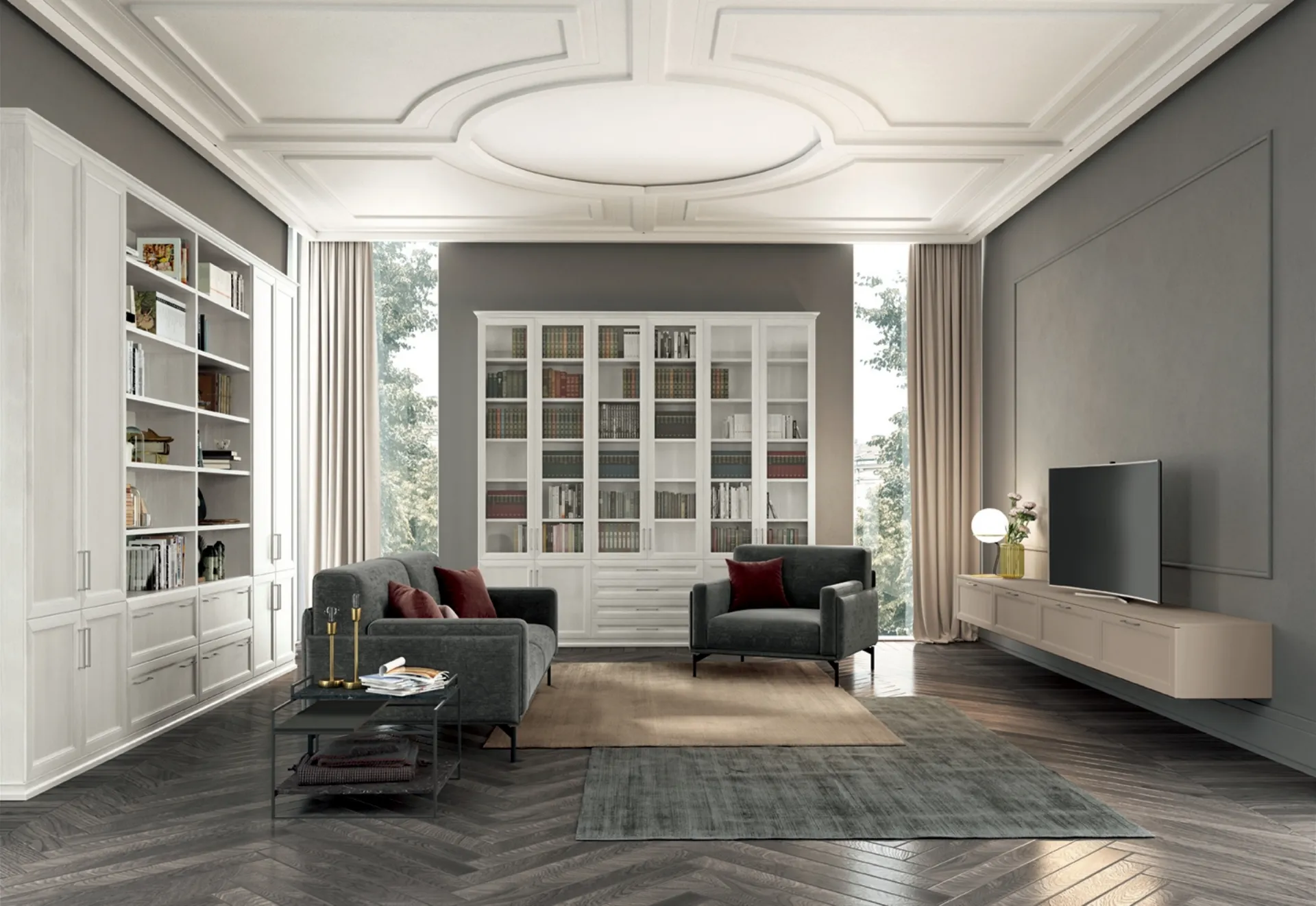 Texture di pregio e forme decise: scopri la libreria Arcadia AS006 di Colombini Casa tra le più belle Librerie classiche a muro.